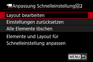 - Wählen Sie [Alle Elemente löschen], um alle Elemente aus dem Layout zu entfernen, sodass der Schnelleinstellungsbildschirm nicht angezeigt wird, auch wenn