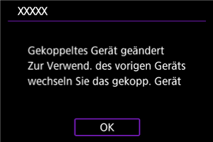 - Es wird eine Meldung angezeigt, wenn die Kamera bereits mit einem anderen Gerät gekoppelt ist. Wählen Sie [OK], um die aktuelle Bluetooth-Verbindung zu beenden.