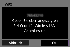 Dies ist eine Verbindungsmethode, die für mit WPS kompatible Zugangspunkte verwendet wird. Im PIN-Code-Verbindungsmodus (PIN-Modus) wird eine auf der Kamera angegebene 8-stellige Kennung am Zugangspunkt festgelegt, um eine Verbindung herzustellen.