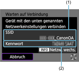 - Wählen Sie in den WLAN-Einstellungen des anderen Geräts die SSID (Netzwerkname), die auf dem Kamerabildschirm angezeigt wird, und geben Sie dann das Kennwort ein.