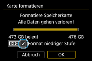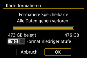 - Während der Formatierung auf niedriger Stufe können Sie die Formatierung durch Auswahl von [Abbruch] abbrechen. Die herkömmliche Formatierung wird dennoch abgeschlossen, und Sie können die Karte wie gewohnt verwenden.