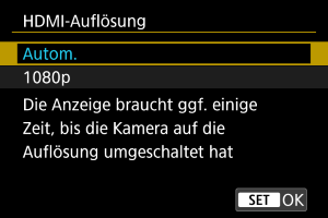 Stellen Sie die Bildausgabeauflösung ein, die verwendet wird, wenn die Kamera per HDMI-Kabel an ein Fernsehgerät oder externes Aufnahmegerät angeschlossen ist.