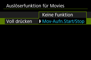Wenn [Voll drücken] auf [Mov-Aufn.Start/Stop] eingestellt ist, können Sie die Movie-Aufnahme nicht nur mit der Taste für Movie-Aufnahme, sondern auch durch vollständiges Drücken des Auslösers oder mit dem Auslösekabel (separat erhältlich) starten/stoppen.
