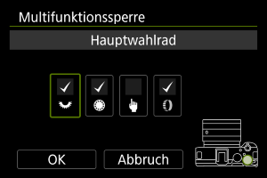 Legen Sie die Kamerasteuerungen fest, die bei aktivierter Multifunktionssperre gesperrt werden sollen. Dies kann verhindern, dass Einstellungen versehentlich geändert werden.