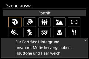Verwenden Sie [] (Porträt), um den Hintergrund zu verwischen und die Person, die Sie aufnehmen, hervorzuheben. Außerdem erscheinen Hauttöne und Haar weicher.