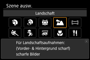 Verwenden Sie [] (Landschaft) für Landschaften, wenn sowohl der Vorder- als auch der Hintergrund scharf sein sollen. Für kräftige Blau- und Grüntöne in scharfen und frischen Bildern.