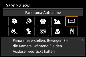 Verwenden Sie [] (Panorama-Aufnahme) für Panoramaaufnahmen. Das Panorama entsteht durch die Kombination von Aufnahmen, die bei Reihenaufnahmen gemacht wurden, wenn Sie die Kamera in eine Richtung bewegen und dabei den Auslöser ganz gedrückt halten.
