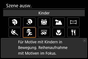 Verwenden Sie den Modus [] (Kinder), um aktive Kinder einzufangen, die sich bewegen. Hauttöne wirken dadurch lebendiger.