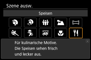 Verwenden Sie [] (Speisen) für Aufnahmen von Speisen. Das Foto wirkt hell und kräftig. Reduziert auch den rötlichen Schimmer von Kunstlicht oder ähnlichen Lichtquellen.