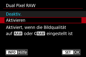 -Bildern aktiviert, werden spezielle Dual Pixel RAW-Bilder mit Dual Pixel-Informationen vom Bildsensor erstellt. Dies wird „Dual Pixel-RAW-Aufnahme“ genannt.