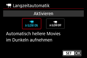 Sie können festlegen, dass Movies aufgenommen werden, die heller und weniger von Bildrauschen betroffen sind als mit der Einstellung [Deaktiv.]. Hierzu wird die Verschlusszeit bei schwachem Licht automatisch verlangsamt.