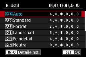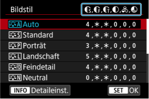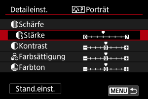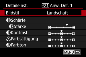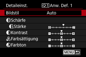- Durch Auswahl von [Stand.einst.] in Schritt 3 können Sie die Parametereinstellungen des jeweiligen Bildstils auf die Standardeinstellungen zurücksetzen.