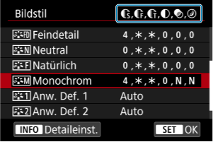 Sie können jeden Bildstil anpassen, indem Sie die Standardeinstellungen ändern. Weitere Informationen zum Anpassen von [Monochrom] finden Sie unter Schwarzweißeinstellung.