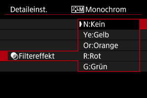 | N:Kein | Normales Schwarz-Weiß-Bild ohne Filtereffekte. |
