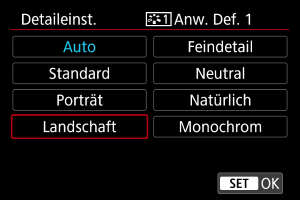 - Um mit einem registrierten Bildstil aufzunehmen, wählen Sie den registrierten [Anw. Def. *] und machen dann ein Foto.