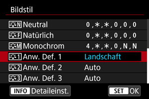 Sie können einen Standard-Bildstil wie [Porträt] oder [Landschaft] auswählen, wie gewünscht anpassen und unter [Anw. Def. 1] – [Anw. Def. 3] registrieren. Dies ist nützlich, wenn mehrere Bildstile mit verschiedenen Einstellungen erstellt werden.