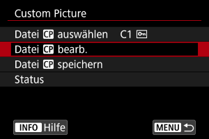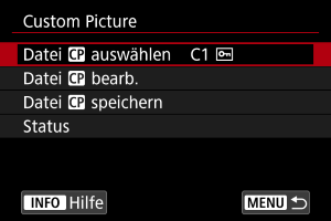 Sie können die Einstellungen für benutzerdefinierte Bilddateien über das [Custom Picture]-Menü überprüfen.