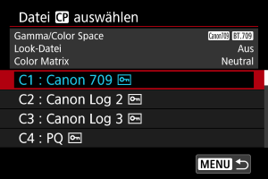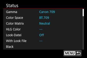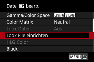 - Eine registrierte Look-File kann nicht verwendet werden, wenn Sie die Einstellungen [Gamma/Color Space], [HLG Color] oder [Over 100%] nach der Registrierung verändern.