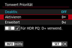 - [Erweitert]: Reduziert überbelichtete Glanzlichter unter bestimmten Aufnahmebedingungen noch mehr als [Aktivieren].