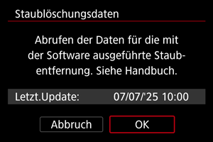 - Nach der Aufnahme ruft die Kamera die Staublöschungsdaten ab. Nach Ermittlung der Staublöschungsdaten wird eine Meldung angezeigt.