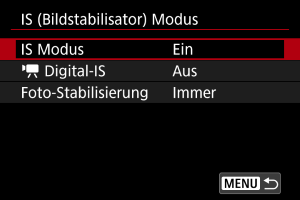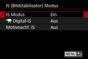 Aktiviert die Stabilisierung des Bildes mithilfe des Objektivs IS. Wird angezeigt, wenn IS-Objektive ohne IS-Schalter verwendet werden. Wird bei anderen Objektiven nicht angezeigt.