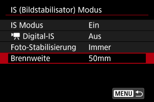 Eine Bildstabilisierung basierend auf der angegebenen Brennweite des Objektivs ist möglich, indem Sie die Brennweite einstellen, wenn Sie Objektive verwenden, die die Objektivkommunikation nicht unterstützen.