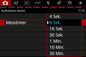 Sie können einstellen, wie lange der Messtimer ausgeführt wird (Festlegung der Dauer der Belichtungswertanzeige/AE-Speicherung), nachdem er nach einer Aktion, etwa halbem Durchdrücken des Auslösers, ausgelöst wurde.