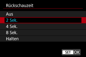 Wenn das Bild unmittelbar nach der Aufnahme angezeigt werden soll, stellen Sie [Halten] ein, und wenn Sie das Bild nicht anzeigen möchten, stellen Sie [Aus] ein.