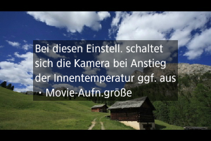 - Movie-Aufnahmen über einen längeren Zeitraum können zu einem Anstieg der internen Kameratemperatur führen und die Bildqualität beeinträchtigen. Schalten Sie die Kamera nach Möglichkeit aus, wenn Sie keine Movie-Aufnahme machen.