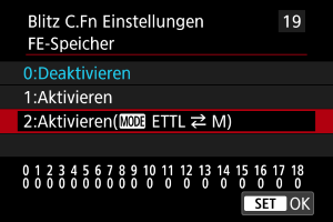 Sie können die im Blitzmodus [ETTL] aufgenommene Blitzleistung als Blitzleistung für den Blitzmodus [M] einstellen, indem Sie die Taste für [ETTL M (mit FEM aktiviert)] in [
