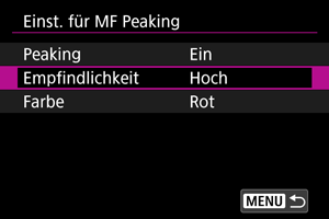 - Ein MF-Peaking ist bei hohen ISO-Geschwindigkeiten möglicherweise schwer zu erkennen, insbesondere wenn die ISO-Erweiterung eingestellt ist. Verringern Sie ggf. die ISO-Empfindlichkeit oder stellen Sie [Peaking] auf [Aus] ein.