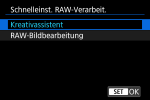 Über den Schnelleinstellungsbildschirm können Sie die Art der RAW-Bildbearbeitung festlegen.