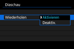 - Stellen Sie die Einstellungen für [Anzeigedauer] und [Wiederholen] (wiederholte Wiedergabe) für die Fotoaufnahmen ein.