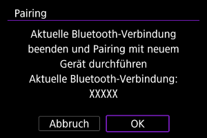 - Die Kamera kann nicht mit mehreren Geräten gleichzeitig eine Bluetooth-Verbindung herstellen. Informationen zum Wechseln zu einem anderen Smartphone für die Bluetooth-Verbindung finden Sie unter Wiederherstellen einer WLAN-/Bluetooth-Verbindung.