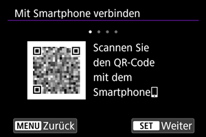- Wenn Camera Connect nicht installiert ist, scannen Sie mit dem Smartphone den QR-Code auf dem Bildschirm. Installieren Sie Camera Connect über Google Play oder den App Store. Drücken Sie dann auf