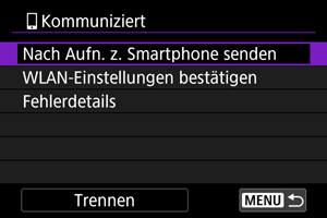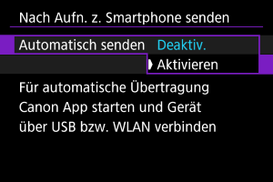 Ihre Aufnahmen können automatisch an ein Smartphone gesendet werden. Vergewissern Sie sich vor dem Ausführen dieser Schritte, dass die WLAN-Verbindung zwischen Kamera und Smartphone getrennt ist.
