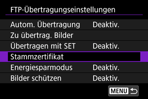 Wenn Sie beim Konfigurieren der Verbindungseinstellungen den FTP-Modus [FTPS] angegeben haben, muss das vom FTP-Server verwendete Stammzertifikat in die Kamera importiert werden.