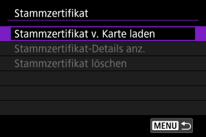 - Es kann nur eine einzige Stammzertifikatsdatei in die Kamera importiert werden. Legen Sie im Voraus eine Karte mit der Stammzertifikatsdatei ein.