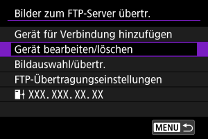 Bevor Sie die Verbindungseinstellungen für andere Geräte bearbeiten oder löschen, beenden Sie die WLAN-Verbindung. Dieser Abschnitt befasst sich mit Elementen, die unter Konfigurieren der FTP-Server-Verbindungseinstellungen nicht beschrieben werden.