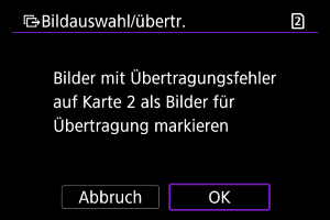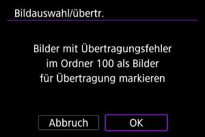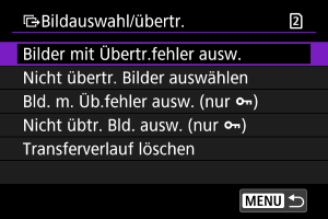- Nach dem Löschen des Übertragungsverlaufs können Sie [Nicht übertr. Bilder auswählen] auswählen und alle auf der Karte gespeicherten Bilder erneut übertragen.