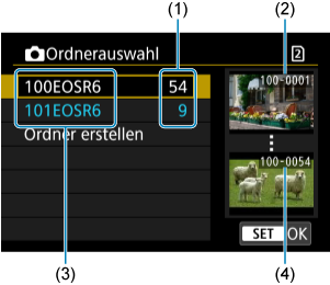 - Ein Ordner kann bis zu 9999 Bilder enthalten (Dateinummer 0001–9999). Ist der Ordner voll, wird automatisch ein neuer Ordner mit einer um eins höheren Ordnernummer erstellt. Bei der manuellen Rückstellung () wird ebenfalls automatisch ein neuer Ordner erstellt. Die Ordnernamen können von 100 bis 999 nummeriert werden.