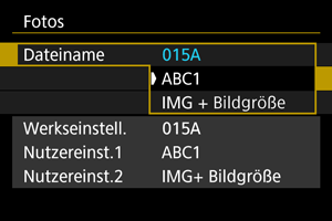 Mit der Benutzereinstellung 1 können Sie vier Zeichen Ihrer Wahl registrieren. In der Benutzereinstellung 2 werden drei registrierte Anfangszeichen Ihrer Wahl zu einem vierten Zeichen hinzugefügt, das die Bildgröße darstellt, die nach der Aufnahme automatisch hinzugefügt wird.
