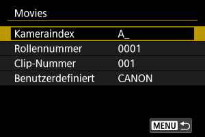 Eine dreistellige Zahl von 001 bis 999, der ein C vorangestellt wird (Beispiel: C001-C999). Nach C999 wird am Anfang ein D verwendet. Wird jedem Clip (Movie-Datei) automatisch zugewiesen. Sie können den Standardwert einstellen. |