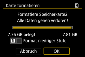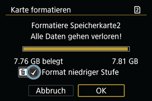 - Während der Formatierung auf niedriger Stufe können Sie die Formatierung durch Auswahl von [Abbruch] abbrechen. Die herkömmliche Formatierung wird dennoch abgeschlossen, und Sie können die Karte wie gewohnt verwenden.