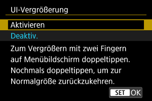 Sie können Menübildschirme durch zweimaliges Tippen mit zwei Fingern vergrößern. Tippen Sie erneut zweimal, um die ursprüngliche Anzeigegröße wiederherzustellen.