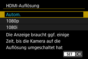 Stellen Sie die Bildausgabeauflösung ein, die verwendet wird, wenn die Kamera per HDMI-Kabel an ein Fernsehgerät oder externes Aufnahmegerät angeschlossen ist.