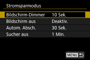 Sie können den Zeitpunkt einstellen, zu dem sich der Bildschirm verdunkelt und dann ausschaltet, zu dem sich die Kamera ausschaltet und zu dem sich der Sucher ausschaltet, nachdem die Kamera nicht benutzt wurde (Bildschirm verdunkeln, Bildschirm aus, Automatische Abschaltung und Sucher aus).