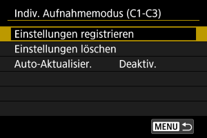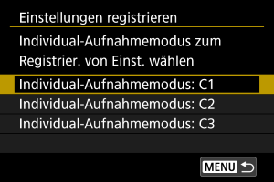 - Die aktuellen Kameraeinstellungen werden im Individual-Aufnahmemodus C* registriert.