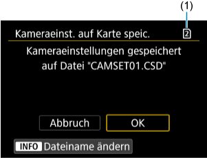 - Es können bis zu zehn Kameraeinstellungsdateien auf einer Karte gespeichert werden. Enthält die Karte bereits zehn Kameraeinstellungsdateien, können Sie eine vorhandene Datei überschreiben oder eine andere Karte verwenden.