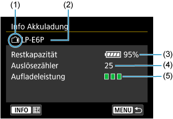 - Die Informationen zur Akkuladung werden auch angezeigt, wenn optionale Akkugriffe verwendet werden.